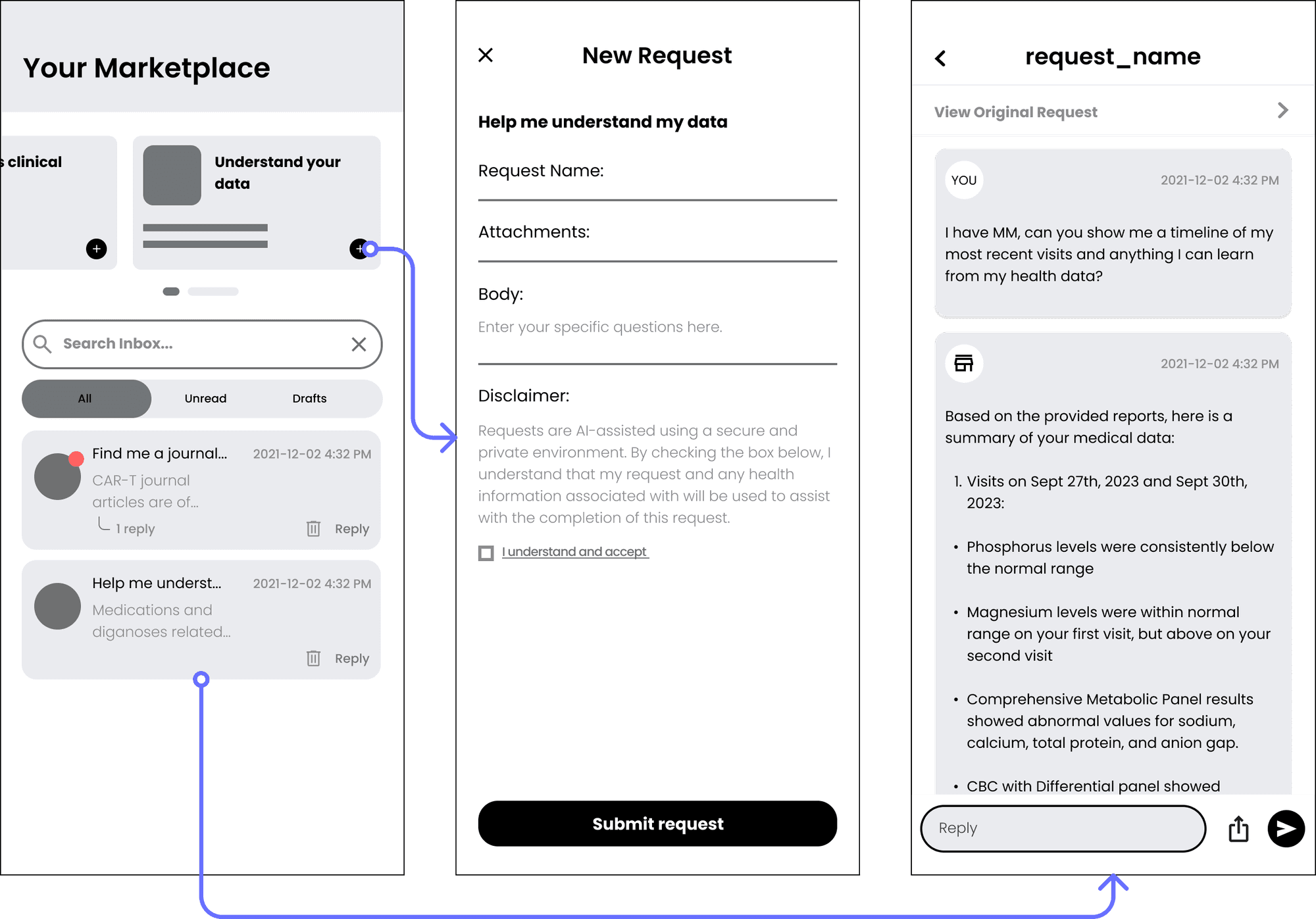 User testing revealed that users don’t always know what to ask, and the user journey from journal to understanding data was complex.
