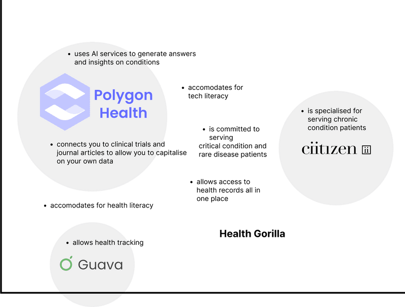 Polygon Health was in an MVP state within an emerging market that didn’t have clear bounds yet. Some constraints we considered were the small user base of patients with rare conditions, rough product state (MVP), data privacy and user trust, user accessibility (health and tech literacy), and the lack of a user research pipeline