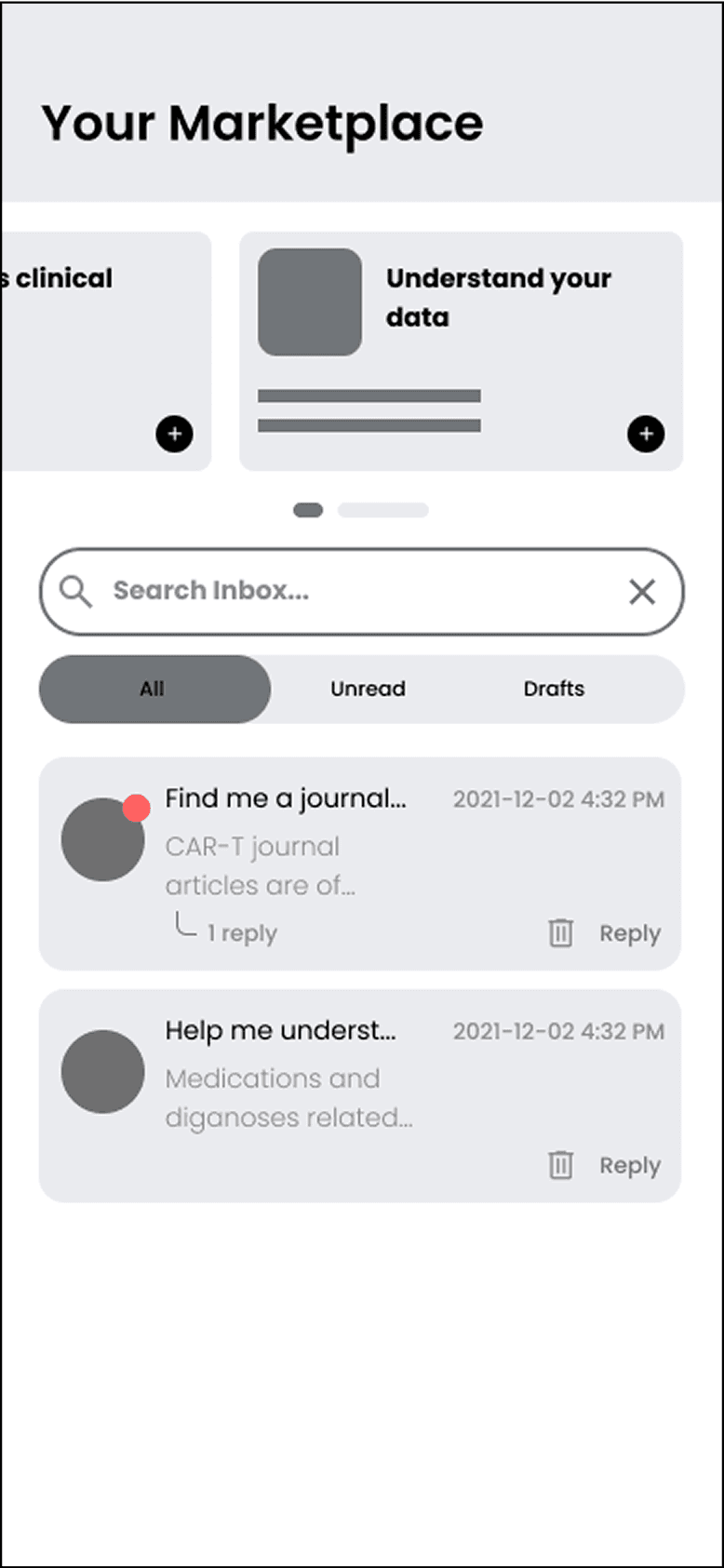The carousel concept was changed to include more description, and allow simple vertical scrolling interactions.The title cards were also moved below the inbox bar to keep with the conceptual inbox model.